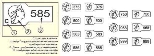 Все золотые украшения, продающиеся на территории страны, подлежат апробированию и государственному клеймению. За этот процесс отвечает пробирная служба. Пробирное клеймо означает, что сплав прошел проверку и гарантированно содержит указанную долю драгметалла. На фото видно, как выглядит российское клеймо 750 пробы.