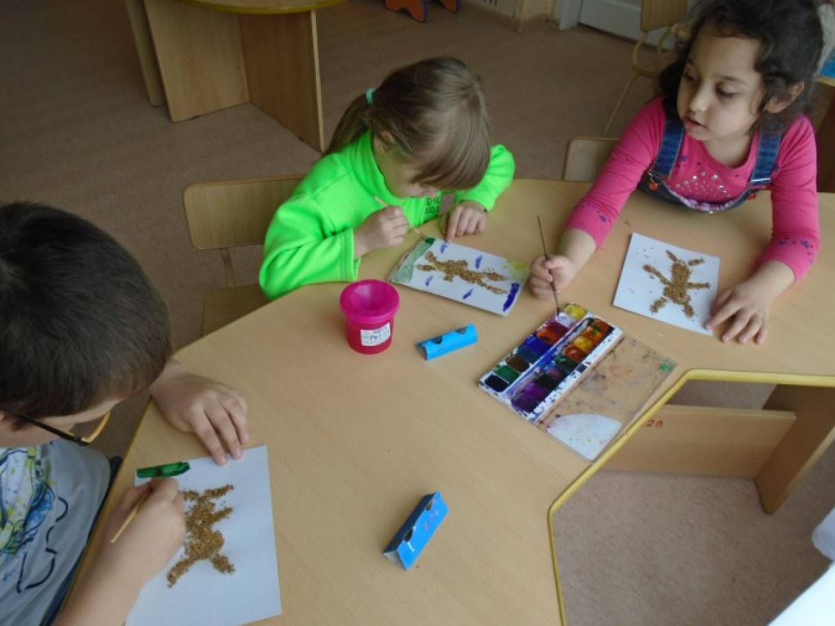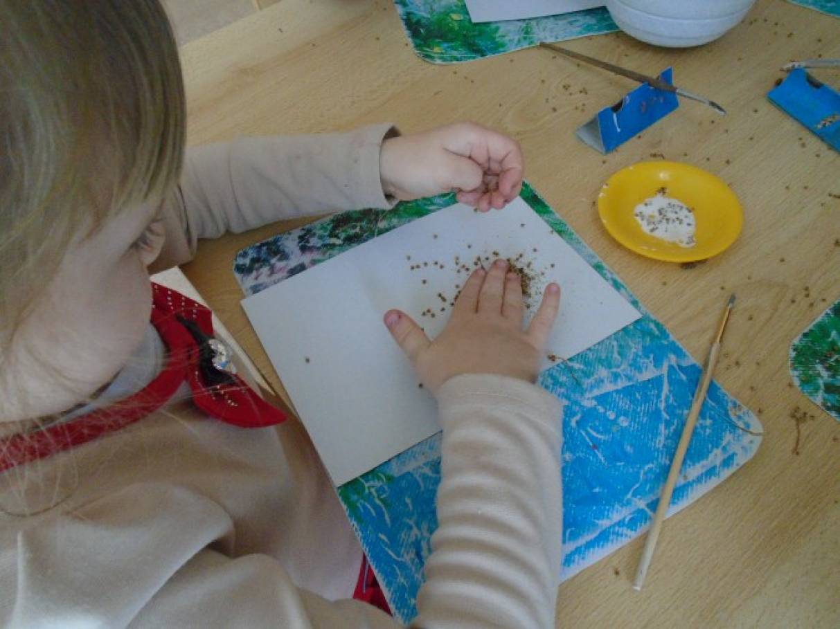 Сначала нарисовали голову и сразу посыпали нашей заготовкой. Иногда поправляли пальчиками, чтобы ровнее было, иногда прижимали, потому, что семена берёзы постоянно пытались куда- то укатится.