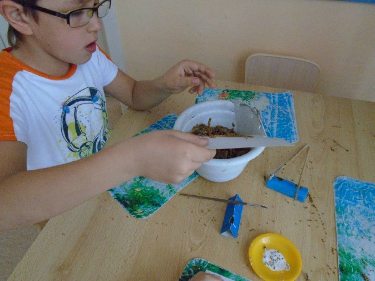 Для этого взяли клей ПВА, кисточку, клеёнку, картон и основной материал – сухие берёзовые серёжки.