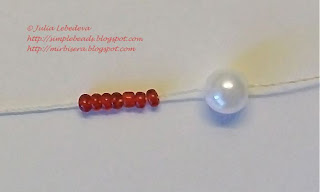 Набираем на нить 8 бисеринок. Размещаем набор примерно в 15 см от свободного конца нити. Мысленно нумеруем бисеринки в том порядке, в каком мы набирали их на нить, с номера 1 до номера 8.