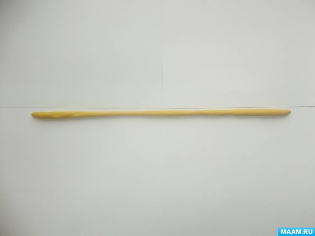 Скатали колбаской так, чтобы ее ширина была одинаковой, разрезали на одинакового размера кусочки, из которых скатали шарики (получилось 9 штук).