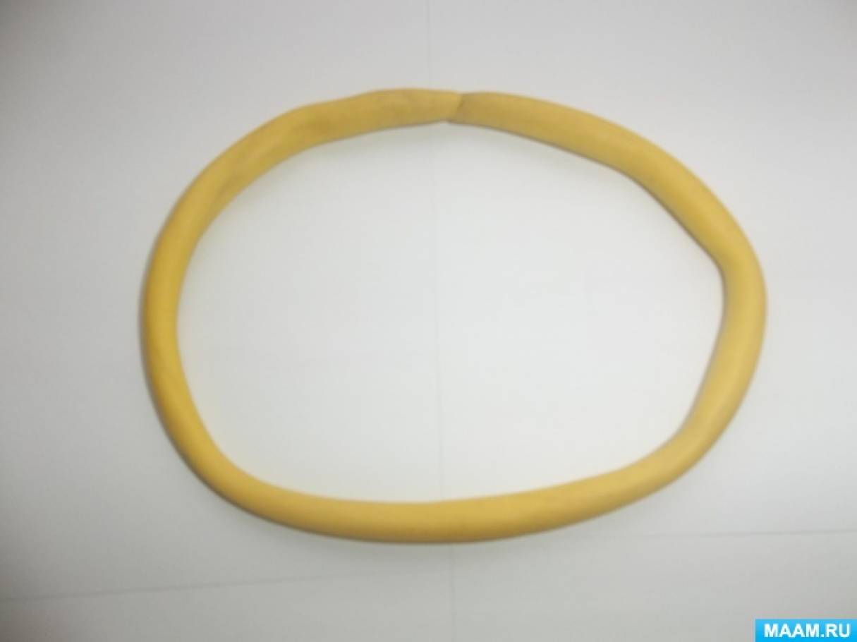 Изготавливать набор начинаем с колье. Для этого берем желтый пластилин, скатываем из него длинный жгут. Концы соединяем так, чтобы получилось большое кольцо.