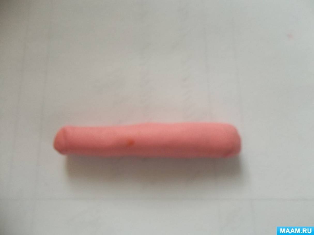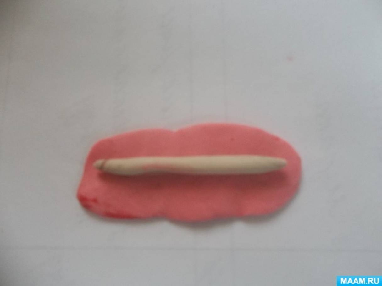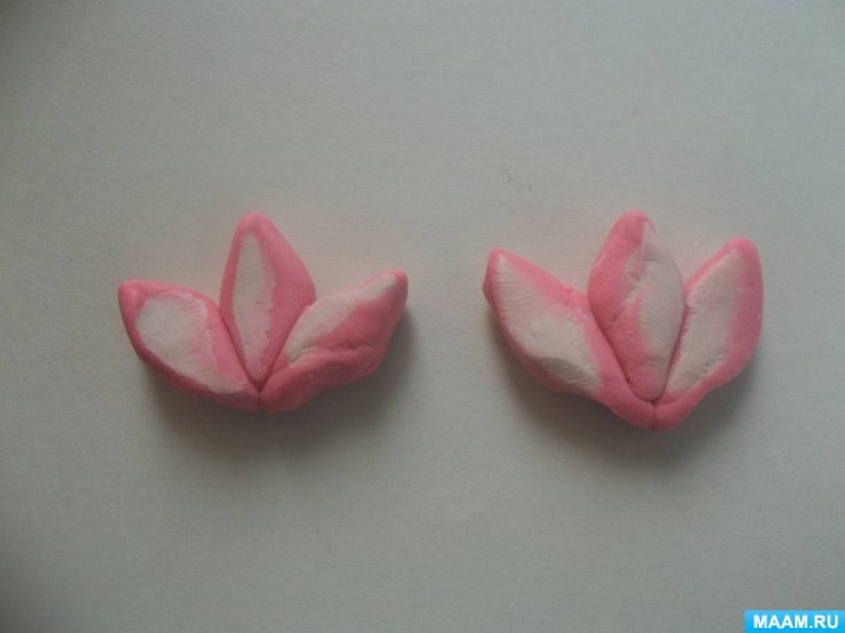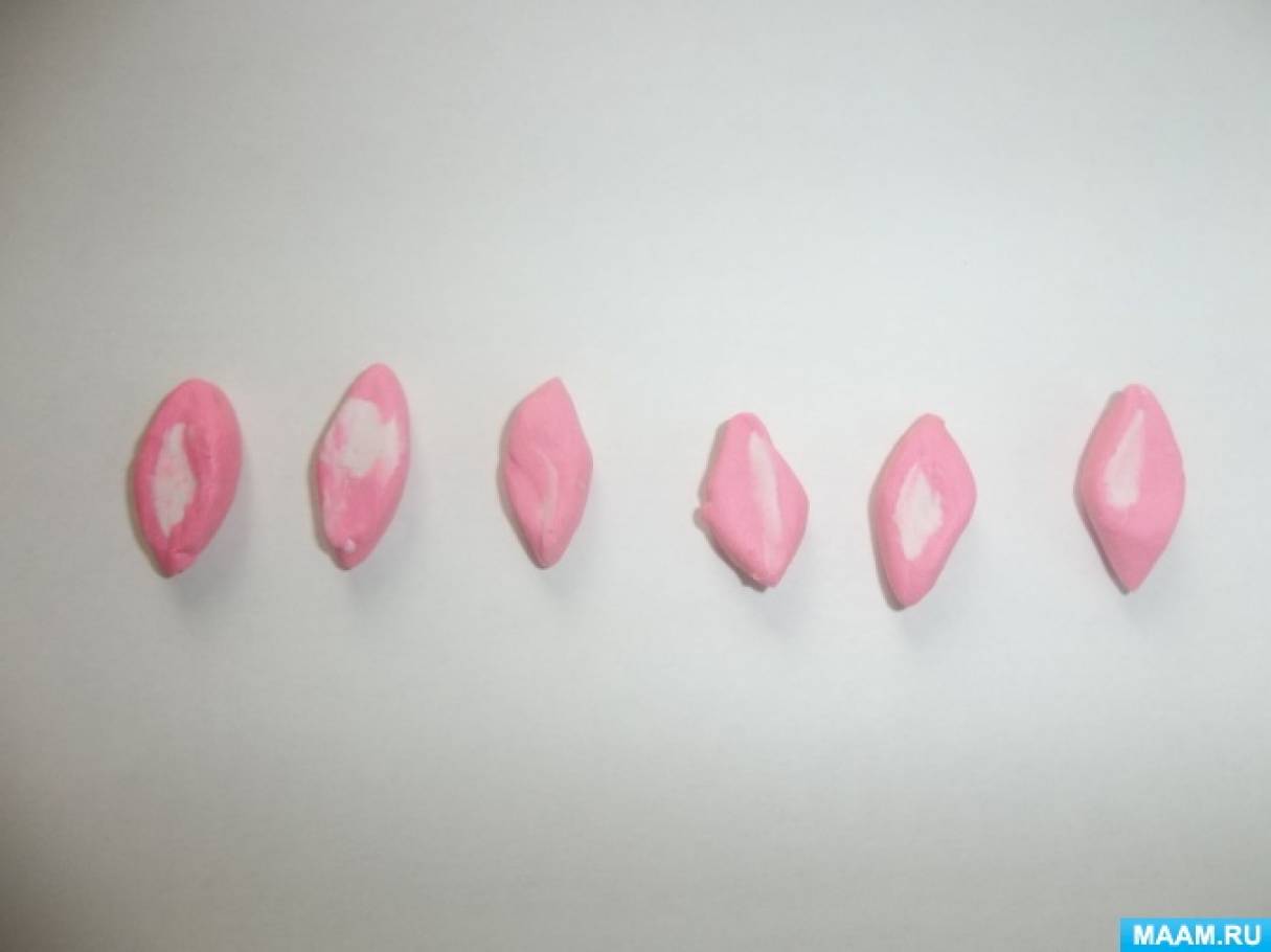 Из белого и розового пластилина лепим цветок. Лепестки будут необычными, двухцветными. Для этого из белого пластилина скатываем жгут, а из розового – пластину. Белый жгут вкладываем в розовую пластину, заворачиваем и скатываем в жгут. Таким образом белый пластилин оказывается в центре розового жгута.