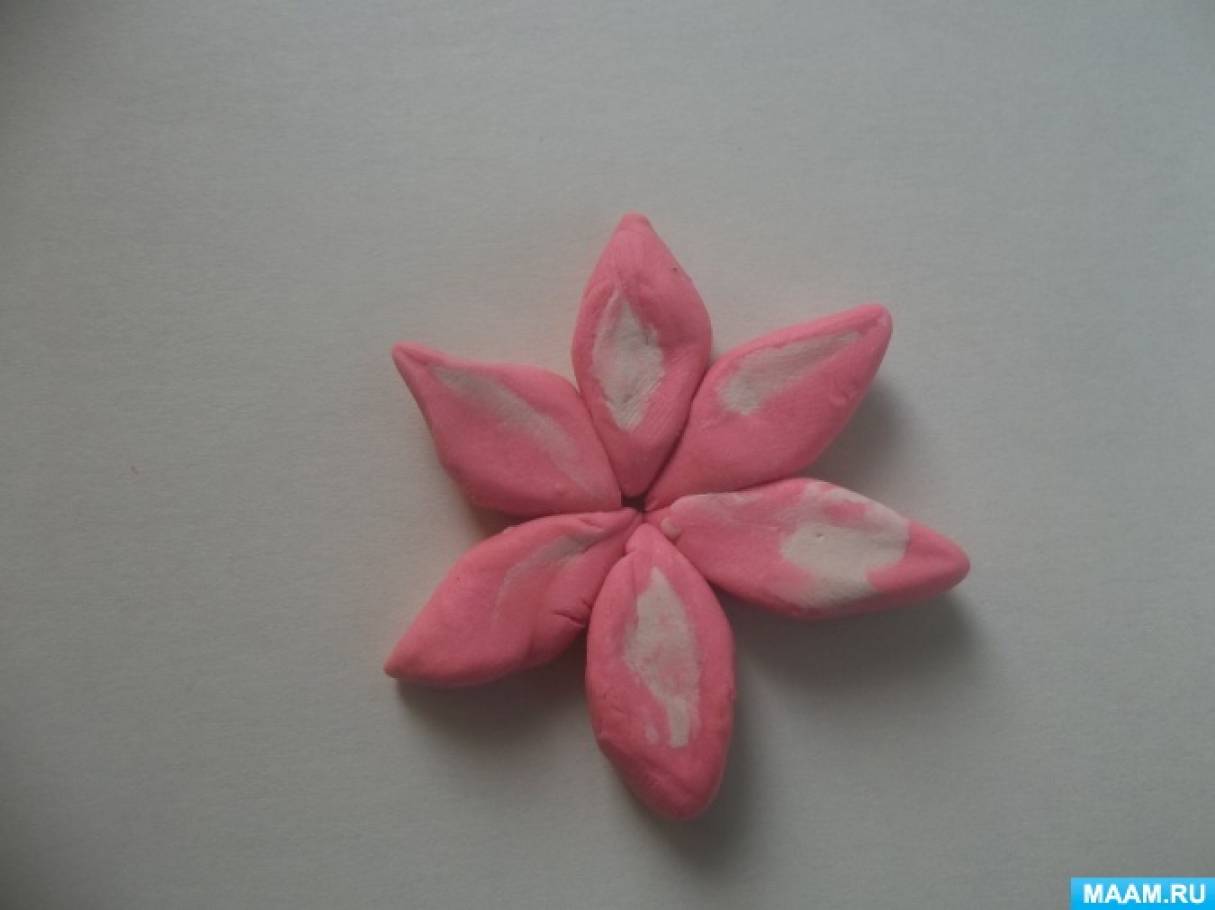 Стекой разрезаем жгут на двенадцать ровных частей. Этим частям мы придадим веретенообразную форму. Из шести лепестков путем соединения частей приемом прижимания формируем один цветок, а из остальных шести лепестков тем же приемом лепим два трехлепестковых цветка.