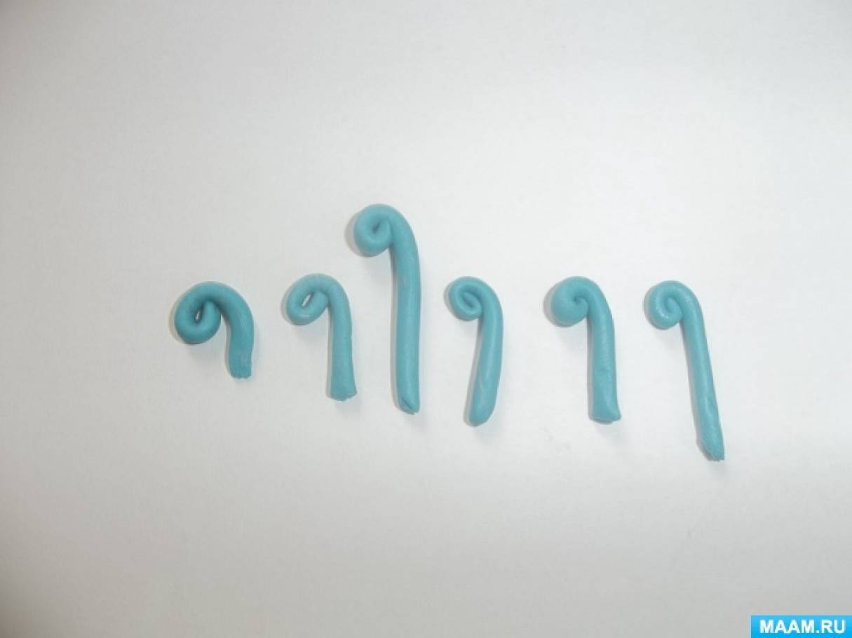Из зеленого пластилина скатываем тонкие жгутики и делим на несколько частей. Из каждой части приемом скручивания кончиков формируем завитки.