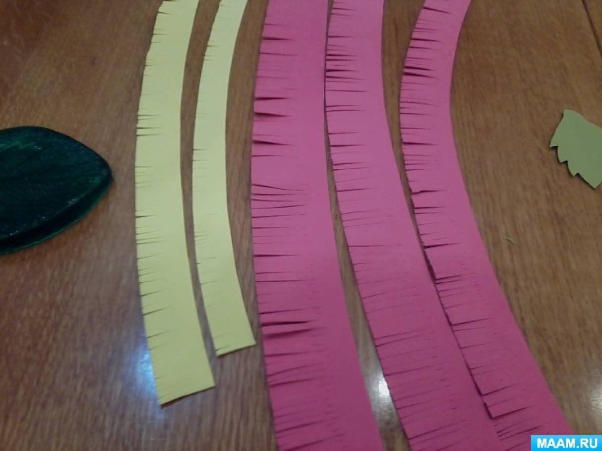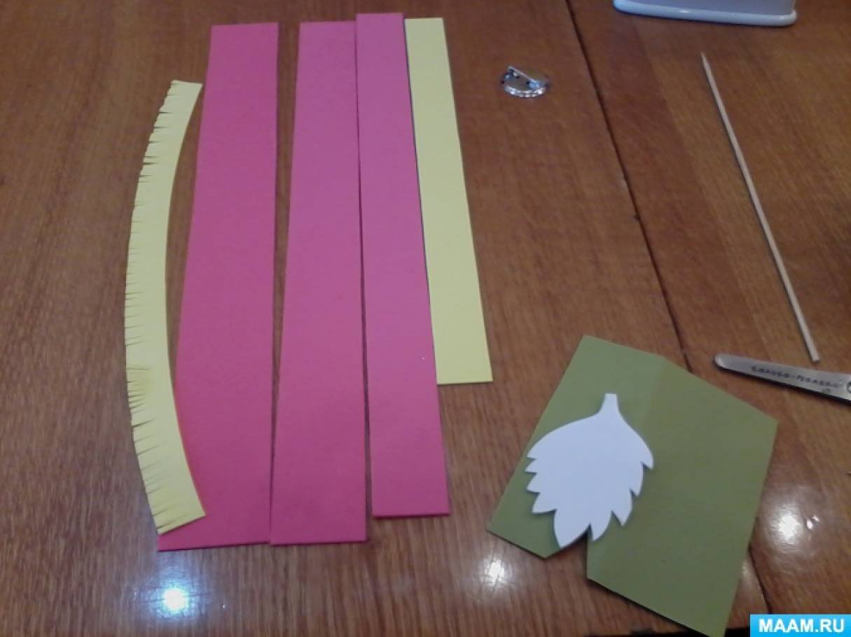 Нарезаем фоамиран на полоски. Жёлтые — 2 полоски размером 2см22см ; Розовые — 1 полоска размером 2,5см29см и 2 полоски размером 3,5см25см;