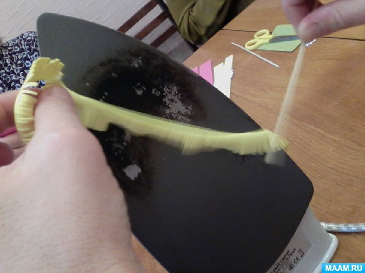 Подносим каждую полоску к утюгу и нагреваем. Во время нагревания кончики материала начнут закручиваться.