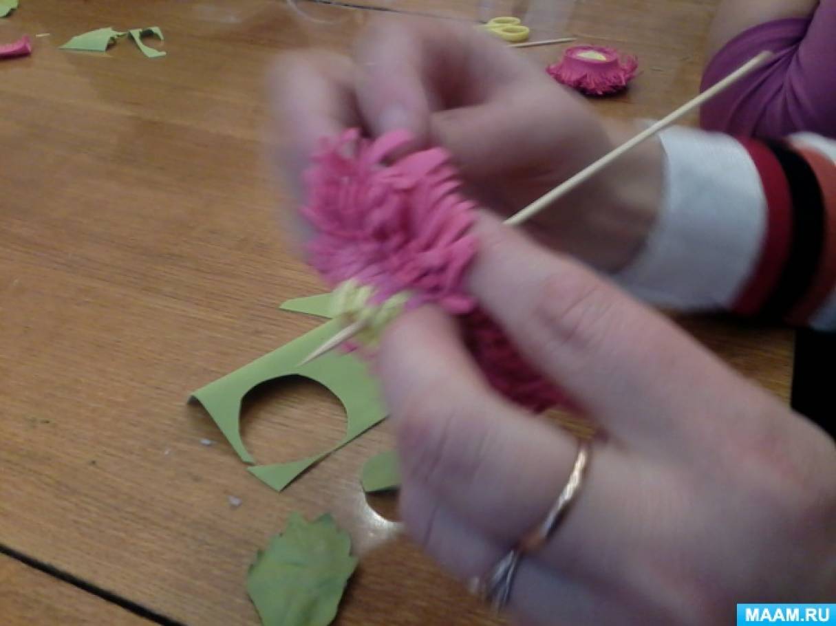 - Завершается изготовление поделки сборкой и фиксацией всех деталей. Для этого понадобится клей. Лепестки в первом ряду проклеиваются вокруг серединки на расстоянии друг от друга в 5 мм. После этого выполняется приклеивание лепестков во втором ряду, соблюдая шахматный порядок. Проволока обрезается, на клей фиксируется два чашелистика, затем останется только приклеить листочки и металлическую брошь. Изделие готово, при желании его можно украсить бисером, цветными камешками или блестками.