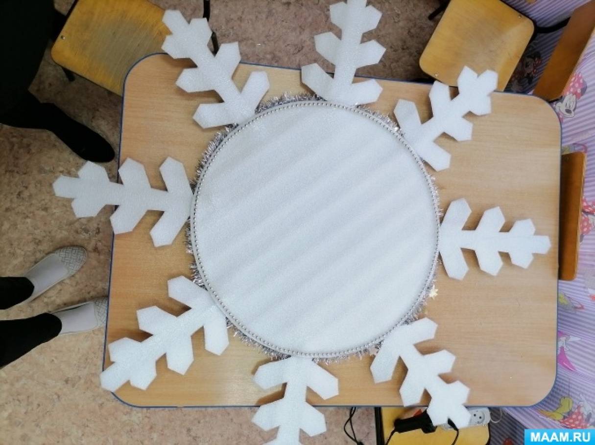 Из утеплителя вырезаем круг нужного диаметра и лучики снежинки.