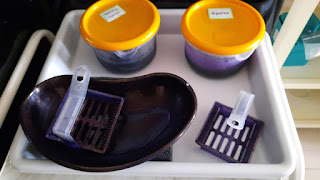 — С эмалированных лотков хозяйственной мыло + очень горячая вода из крана на поток + солянокислый спирт