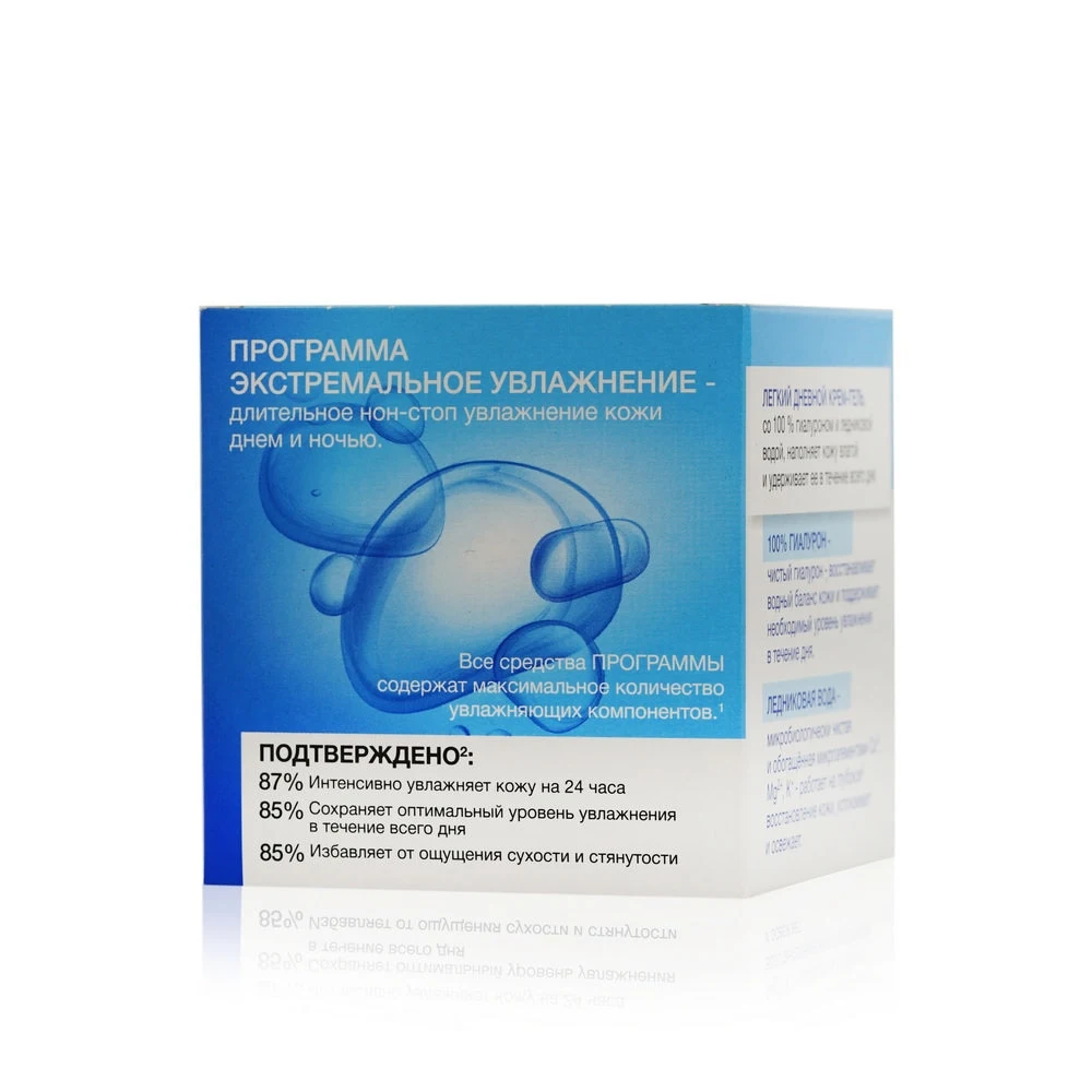 Описание от производителя:Легкий дневной крем-гель для лица Экстремальное увлажнение, со 100 % гиалуроном и ледниковой водой – инновация, разработанная специально для интенсивного увлажнения кожи и сохранения оптимального уровня её увлажнения на 24 часа. Дневной крем обладает легкой гелевой текстурой, которая наполняет кожу влагой и удерживает ее в течение всего дня, избавляя от ощущения сухости и стянутости.
