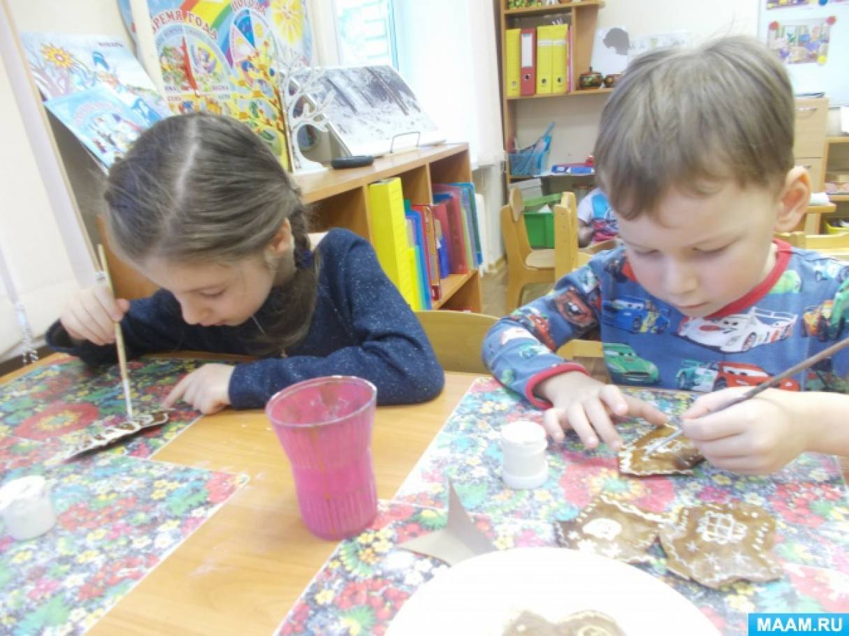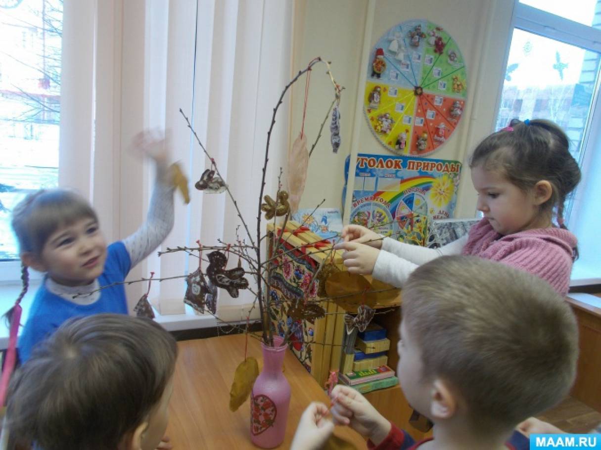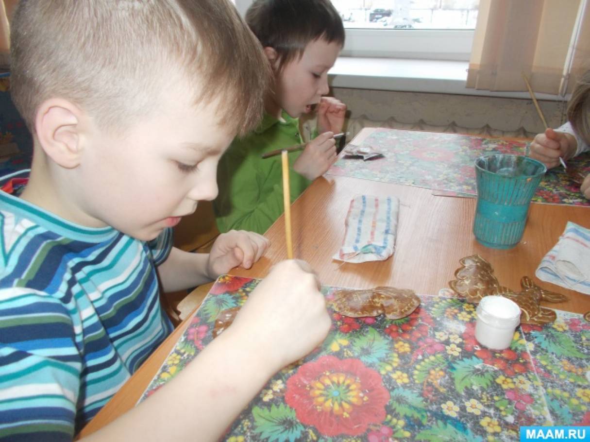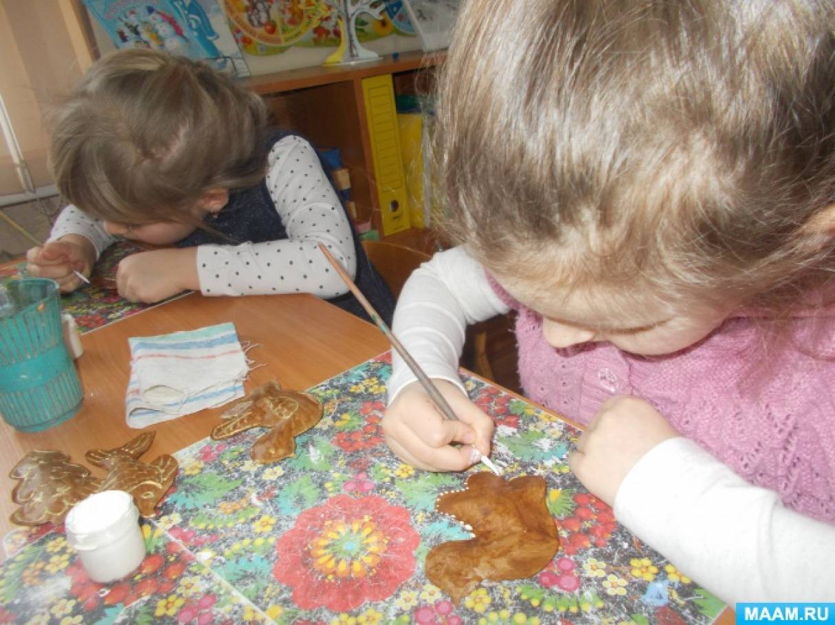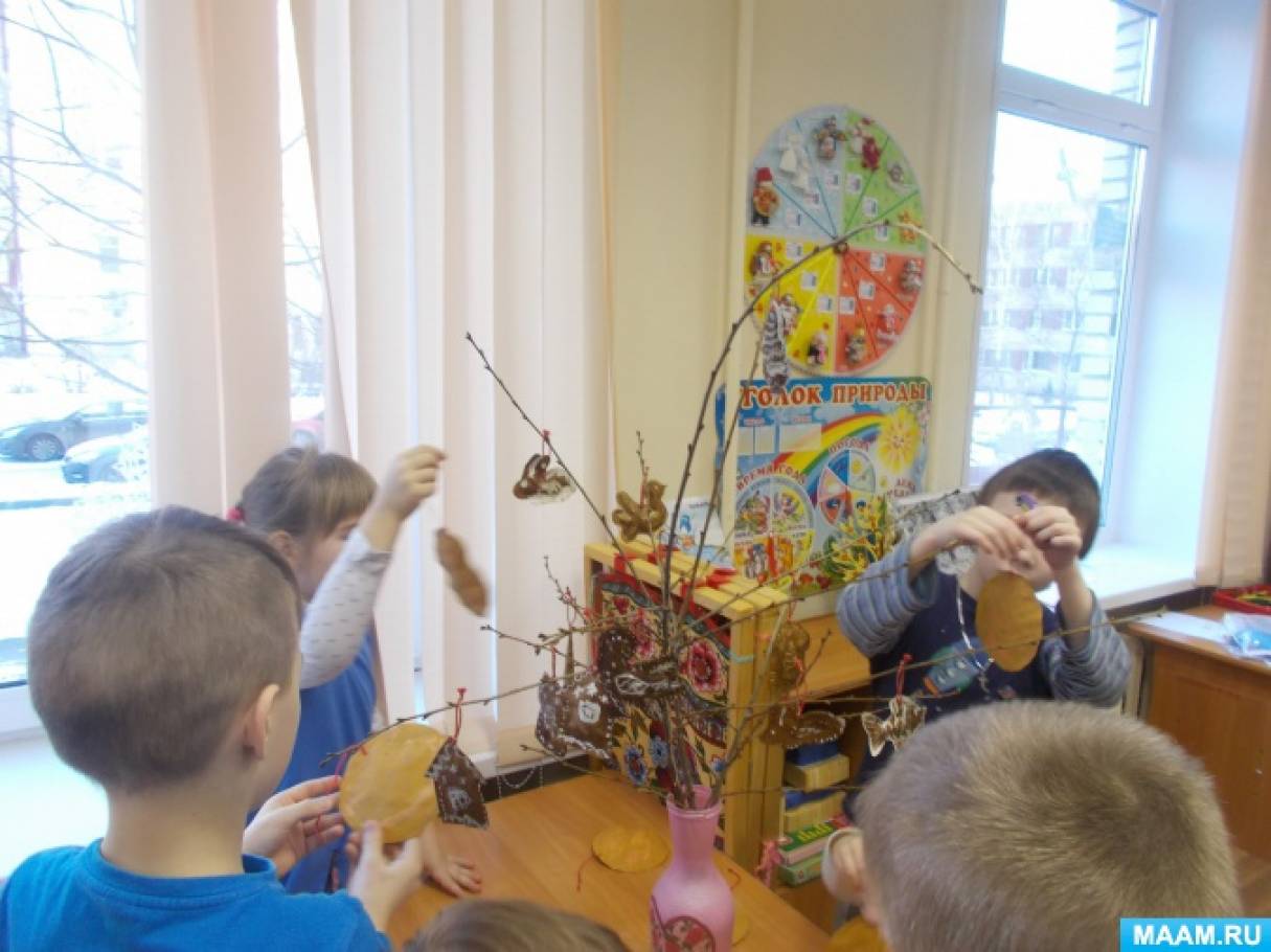 Пока мы творили, в группе стоял такой аромат! Все заходившие в этот день к нам, удивлялись: «Как у вас вкусно пахнет!» Сделали козуль мы не за один день. Сначала вырезали, склеили, наполнили синтепоном, закрасили и положили сушить. На следующий день расписывали тонкой кистью с белой гуашью. И хотя прянички делаются к Рождеству, мы решили украсить ими веточки, пусть висят до Масленицы.