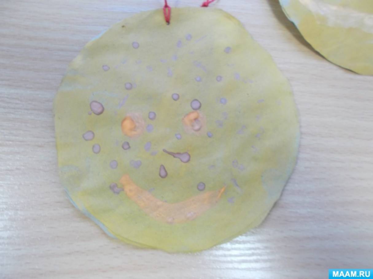 Только краску я для блинов приготовила без кофе. Развела гуашь примерно «блинного» цвета, добавила корицу и ванилин, воду и ПВА. Блины мы покрасили, а когда они высохли, дети палочками ставили на блинах коричневатые точки, имитируя дырки на блинах. Мы наполнили блины немножко синтепоном, чтобы они были пышные. А после всего дети нарисовали своим блинчикам мордашки-смайлики, пусть улыбаются