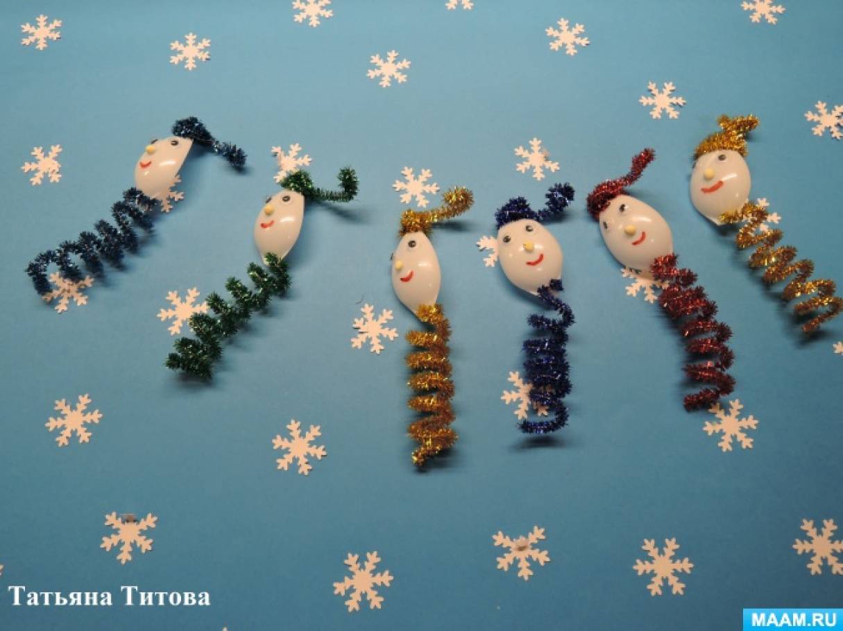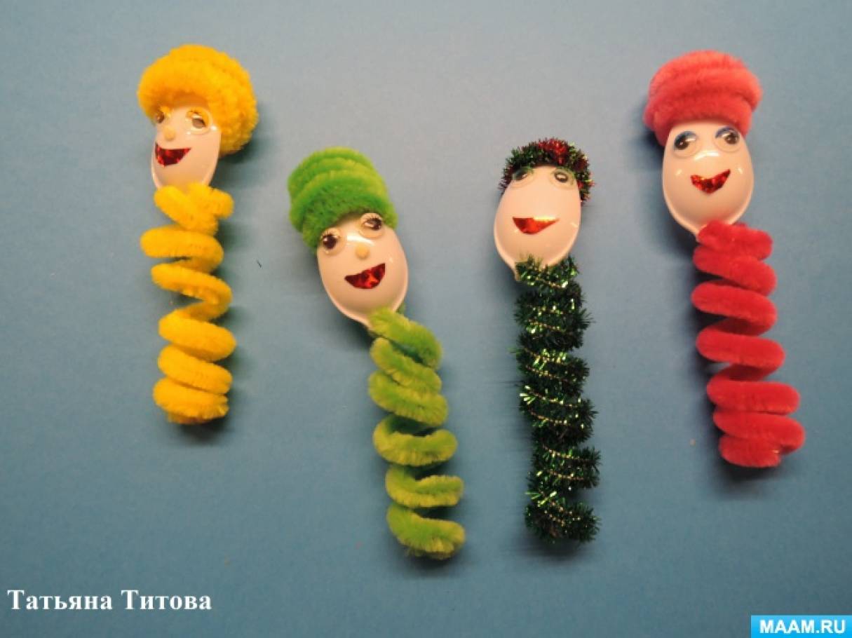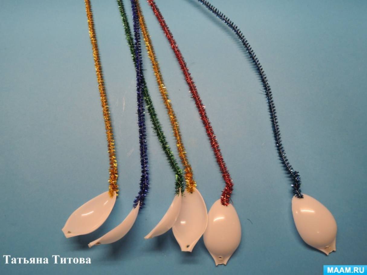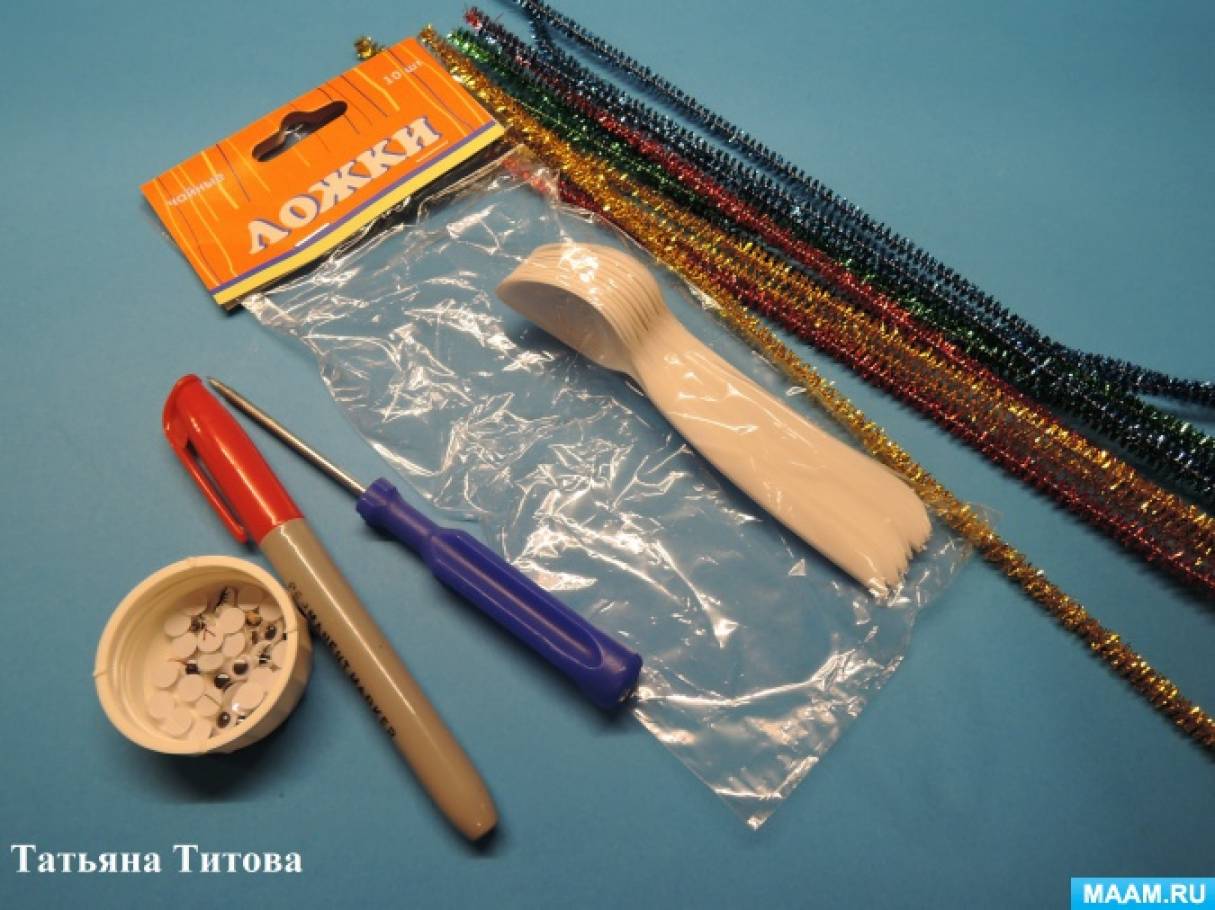 Материал: синельная проволока, мишура, пластиковые ложечки, шило, маркеры, пластиковые глазки.