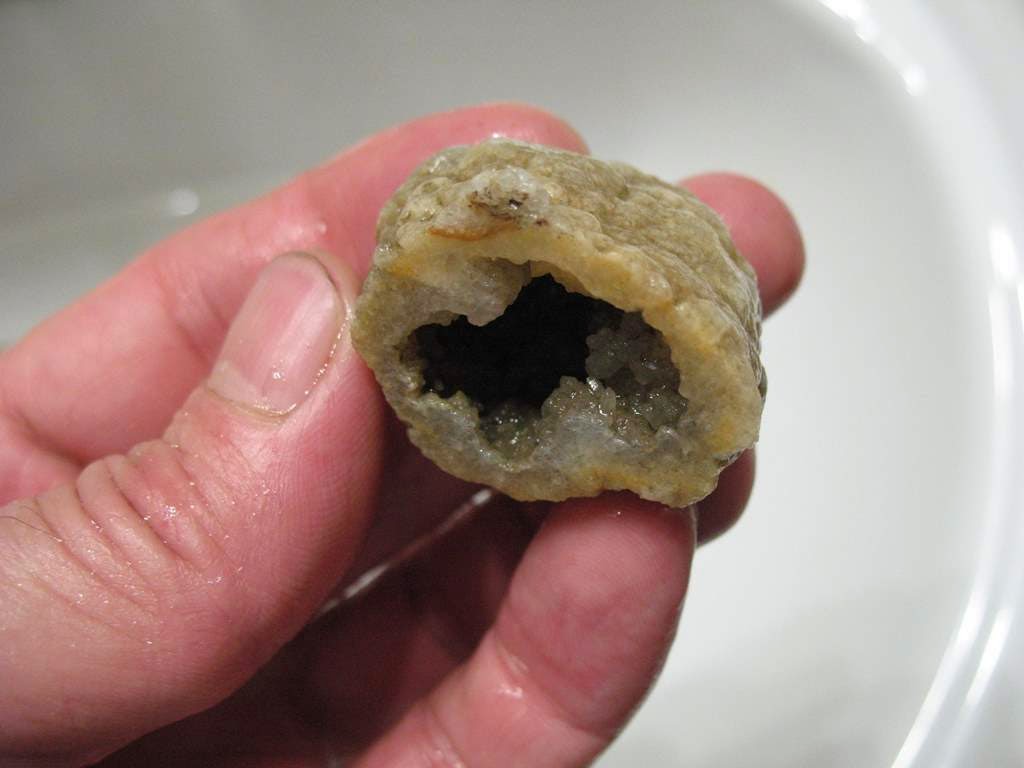 Надо было бы резать в длину. Кристаллики внутри никакие. Какие то корявые и не полноценные. В лупу можно рассмотреть кристаллы кварца двухголовики, но повторюсь не очень хорошего качества. Кварц жеода ( quartz Geode ).