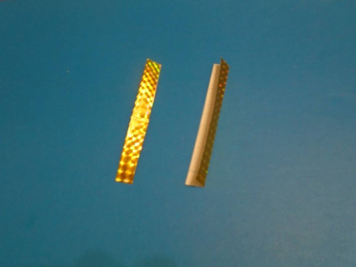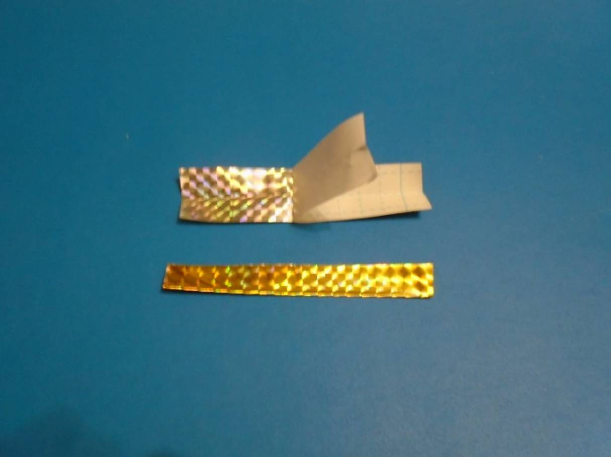 Решили сделать «золотые» звенья с двух сторон. Поэтому первым делом согнули пополам полоску, чтобы наметить сгиб. Далее убрали бумажную подложку и аккуратно опять свернули по сгибу липкие стороны.
