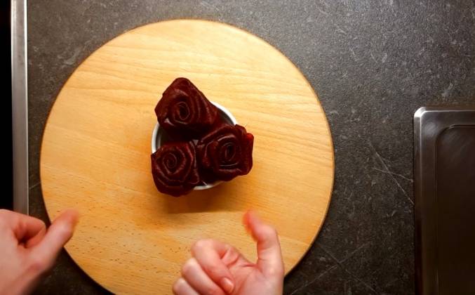 Берем полоску с нарезанными кусочками и начинаем заворачивать ее с одного конца внутрь. Так делаем, пока не дойдем до второго края пастилы. Готовый цветочек ставим в гофрированный стаканчик (те, что используются для кексов).