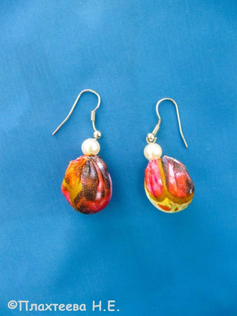 В комплект к бусам я сделала серьги. Из лоскутков сшила маленький мешочек, опустила в него камушек, стянула вверху и закрепила ниткой. Затем закрепила к петельке серьги