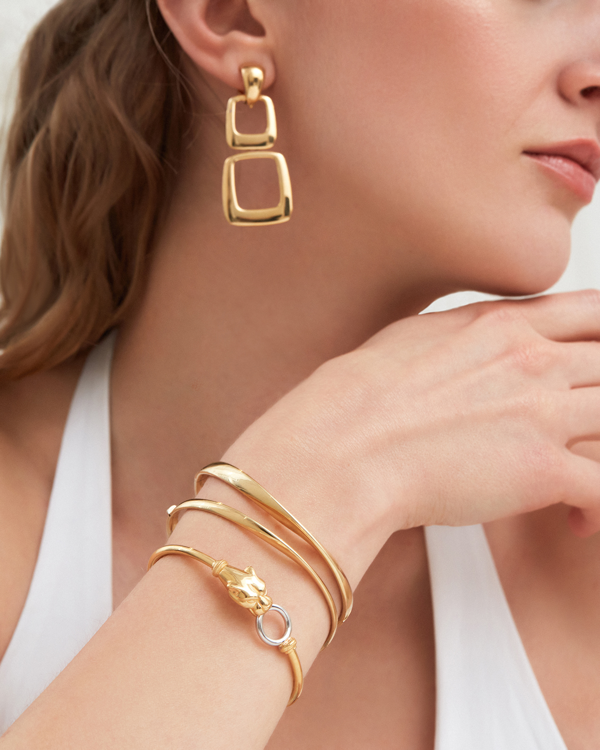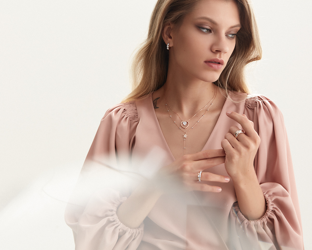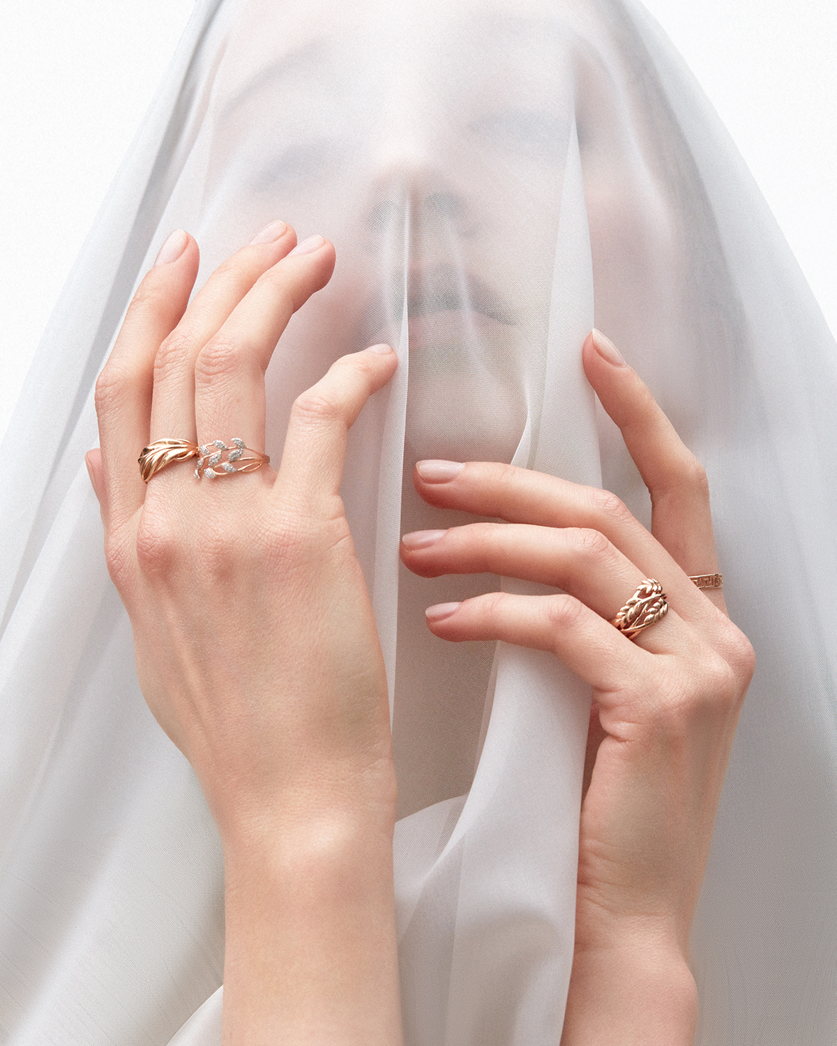 Украшения для волос, воздушные и трансформируемые модели, двойные кольца – изделия с бриллиантами для любой части тела подчеркивают уникальный стиль Дома Messika. Чистота линий, свобода движения, мощная энергия, контрастные цвета и световые эффекты: Валери Мессика претворяет в жизнь композицию в ретрофутуристическом стиле с изысканным акцентом, навеянным атмосферой Египта.