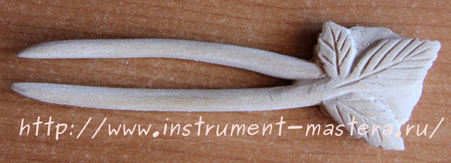 Аналогично вырезаем и обрабатываем наждачкой обратную сторону заколки. Здесь резьба не сложная, поэтому рисунок предварительно можно нанести произвольно карандашом, так как сама форма листьев уже задана при вырезании заготовки по внешним контурам.
