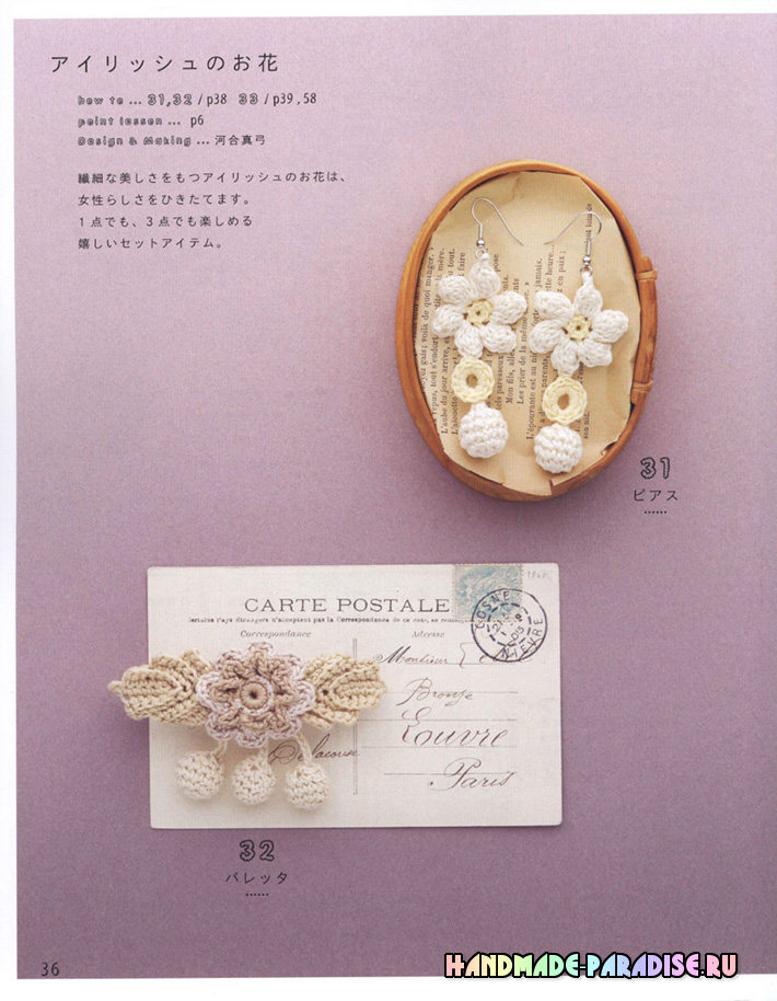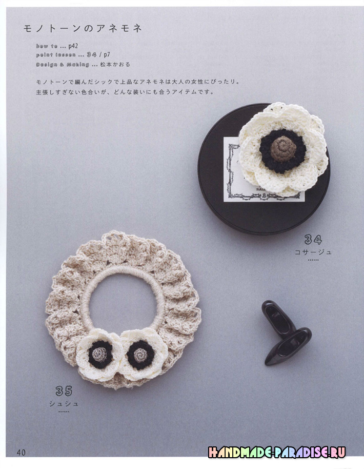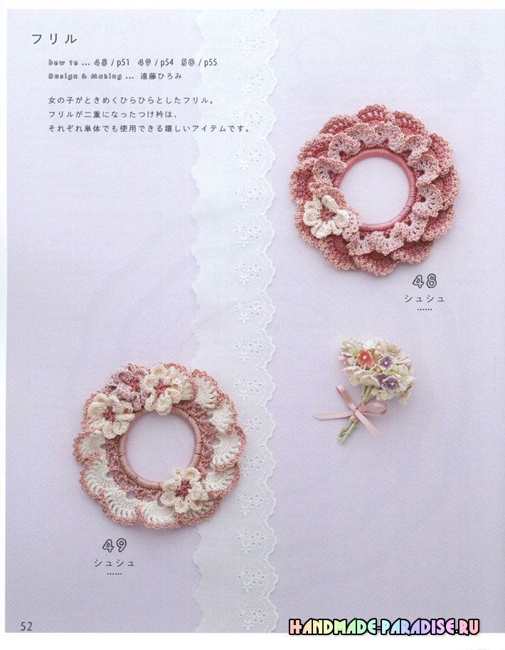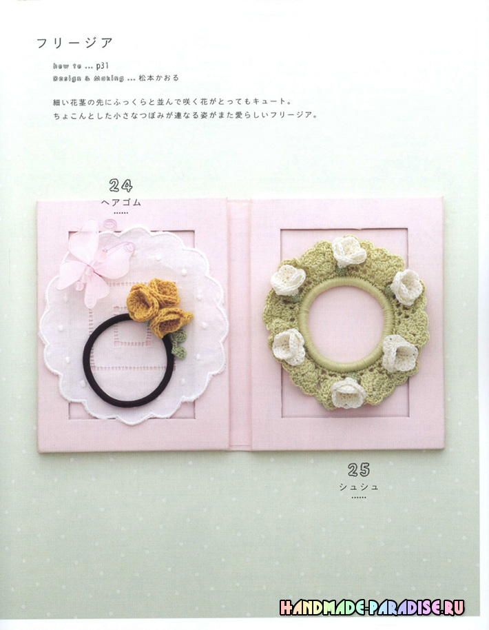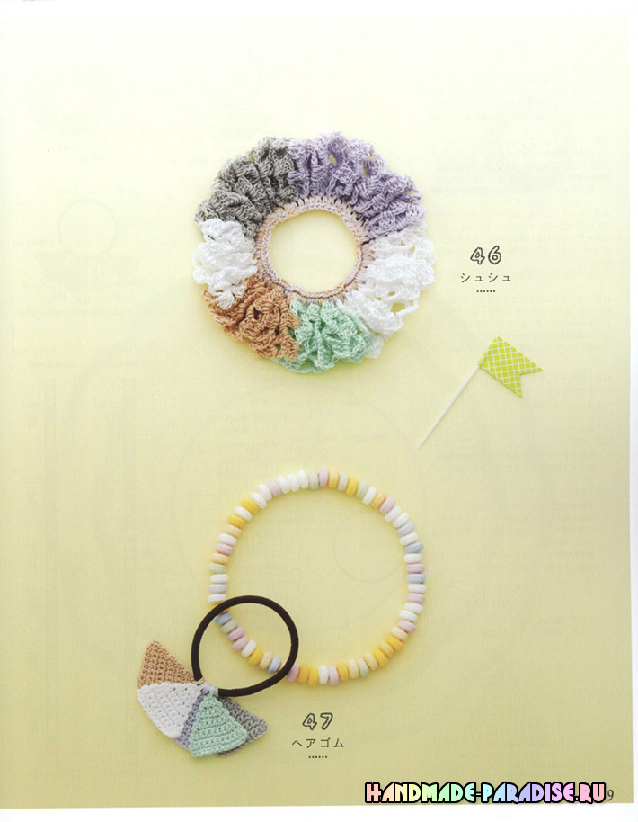 Еще один японский журнал со схемами вязания крючком украшений и модных аксессуаров для девочек. В журнале вы найдете схемы вязания маленьких цветочков, фигурок, сережек, ожерелья, кружевного воротника, а также научитесь обвязывать резинки для волос и создавать красивые аксессуары своими руками.