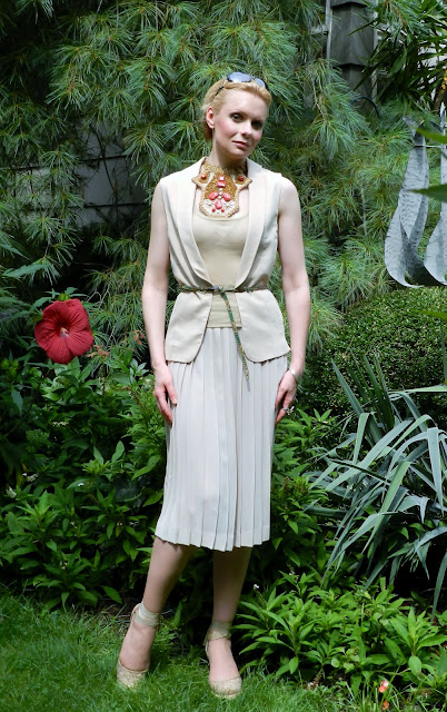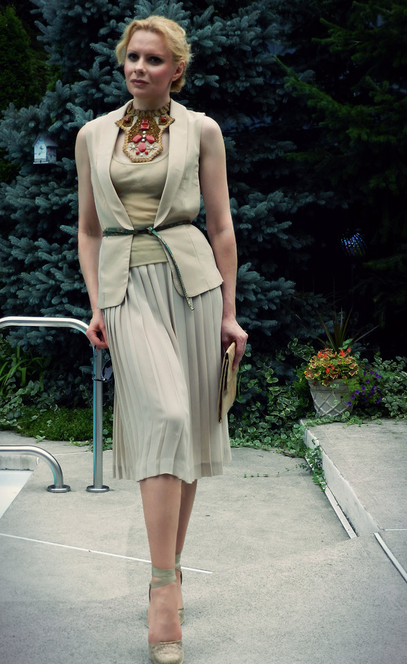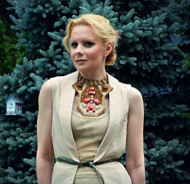 Hello friends, today is Monday. Today’s DIY is my another creation — another necklace, it is in «Egyptian» style. This amazing necklace I found in old burda moden magazine, see it below, it is so beautiful, they don’t tell you about the necklace and how to make it, it is just their idea of how to accesorize the blouse. But I was so blown away by this necklace that decided to make it, I had to have one. This post I decided to do backwards, first show you the pictures of the end product, and then tell you how I made it, so take a look at the pictures: