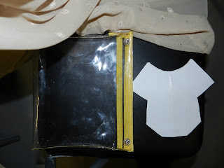 The same I did with the sheer fabric: I put the carton «tie» on it, draw it with the pencil but 1 inch bigger at each side. So I had two ties, one was in plastic and other in sheer fabric, I got rid of the carton after that.