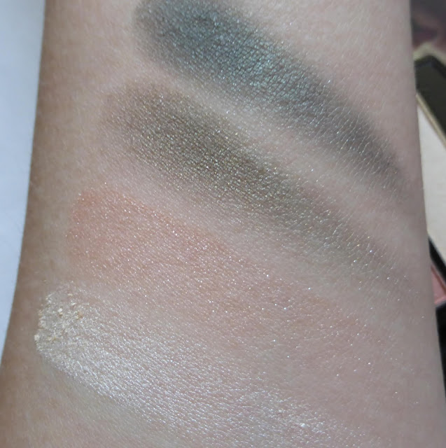 Glacial Turquoise (не нашла на русском сайте этих теней, видимо уже сняли с продажи) — мерцающий молочный, сияющий кораллово-персиковый, мерцающий голубой и матовый серый.