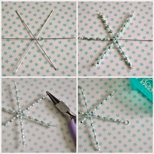 - Основу звезды теперь нужно обматывать тонкой проволокой. В процессе хаотично добавляем разные бусины и бисер.