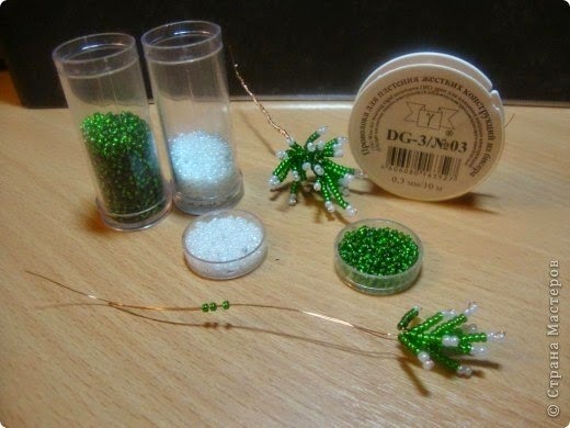 - С другой стороны начинаем нанизывать бисер. Для каждой части свой цвет. В конце проволоки нужно оставить свободный край.