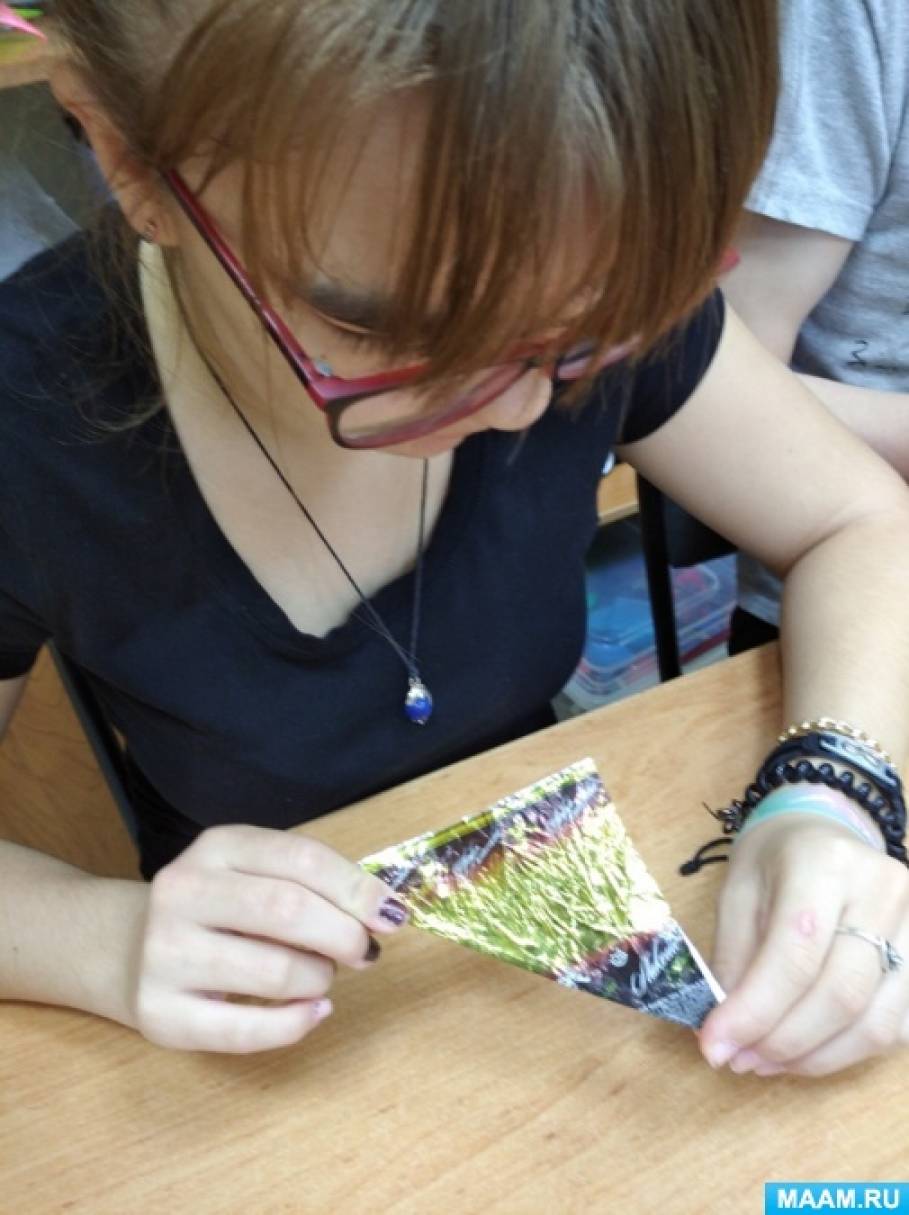 режем наш треугольник по сгибу, не дорезая до центра примерно 1 см