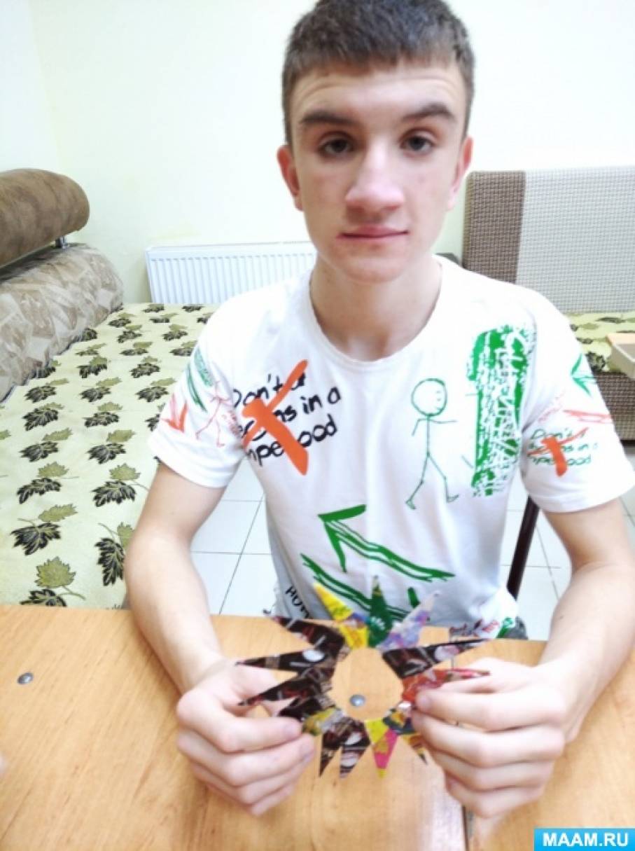 Детский мастер-класс. Поделка из бумажных фантиков «Гусеница» Цель: формирование творческих способностей детей, через изготовление поделки из конфетных фантиков. Задачи: 1. Дать представление о том,.