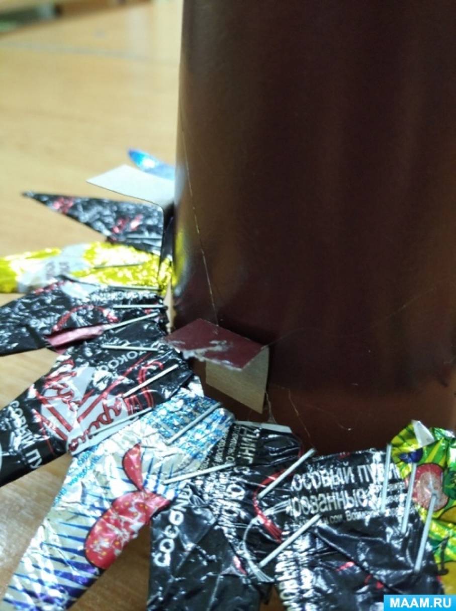 Материал к занятию: конфетные фантики, коричневый картон, клей,кисточки, степлер, салфетки, ножницы.