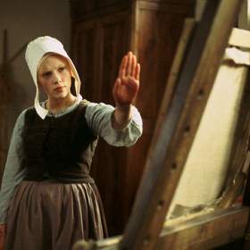 Здесь драматургия элементарна: бедная девушка, гениальный художник, властная теща, истеричная жена, жизнелюбивый заказчик — фигурки на разных планах холста. Туда же — смена времен года; стирка; покупка мяса на рынке; приготовление красок; трапеза; сон; небо. Никакого просветительства, никаких вуайеристских «дневников его жены».