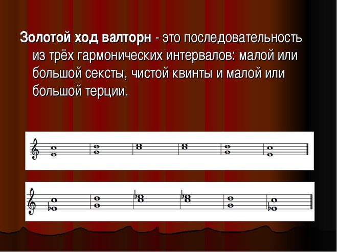 Золотой ход валторн так назван, потому что часто это сочетание используют в оркестре в партии валторн. Звучит это очень красиво и напоминает звуки охотничьих рожков.