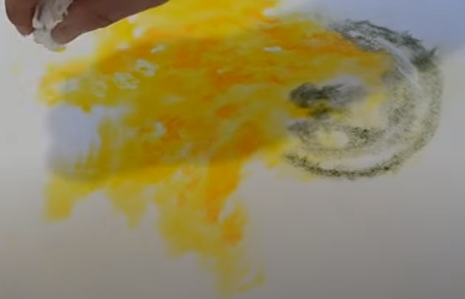 С помощью ватной палочки сначала делаем точечки — пробелы в нашей желтой массе, а затем обмакиваем ее в краску и добавляем немного точек-цветов за пределами основной массы.