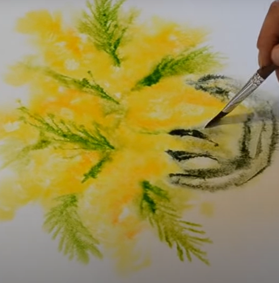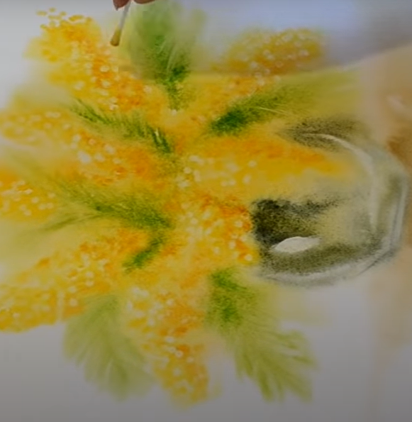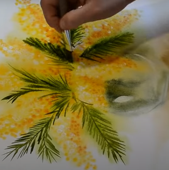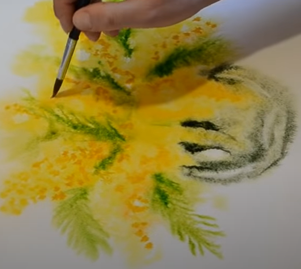 “Лишняя” в данной ситуации оставшаяся влага. Промакиваем ее обыкновенной салфеткой, добавляя тем самым пробелы между цветками мимозы.