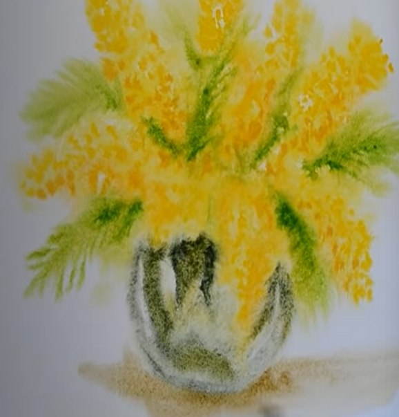 Для того, чтоб ваза не витала в воздухе, необходимо дорисовать поверхность, на которой она стоит, и прорисовать оттенок фона около самих цветов. Стена либо окно должны добавить картине деталей, но не быть слишком яркими, ведь главным героем должна в любом случае остаться мимоза.