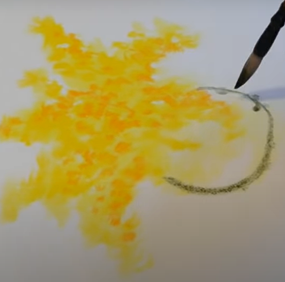 Чтобы сделать градиентный переход необходимо провести линию ярким цветом, затем промыть кисть и добавить более светлый оттенок и так постепенно меняя цвет. Края цветов перемешиваются из-за свойств краски под силой гравитации.