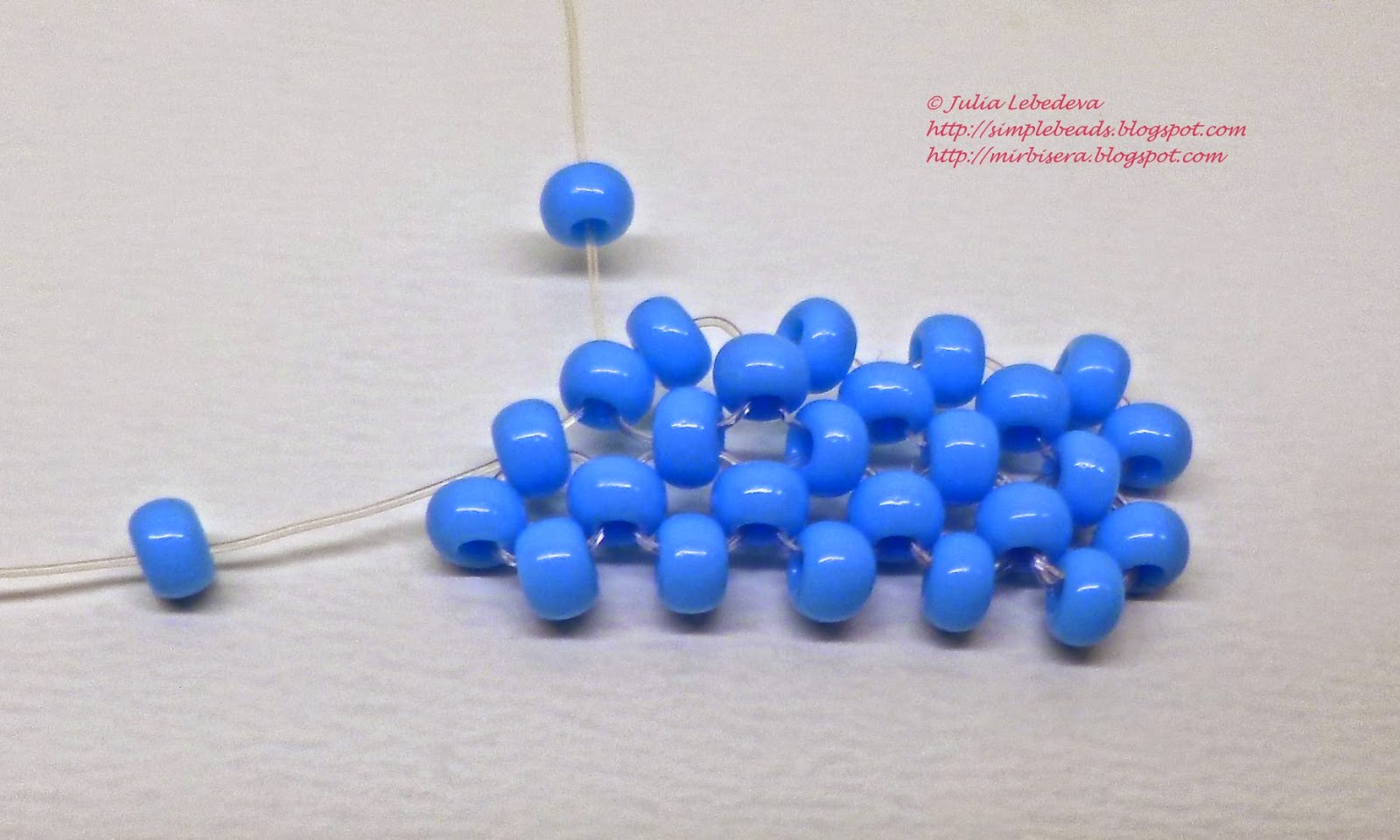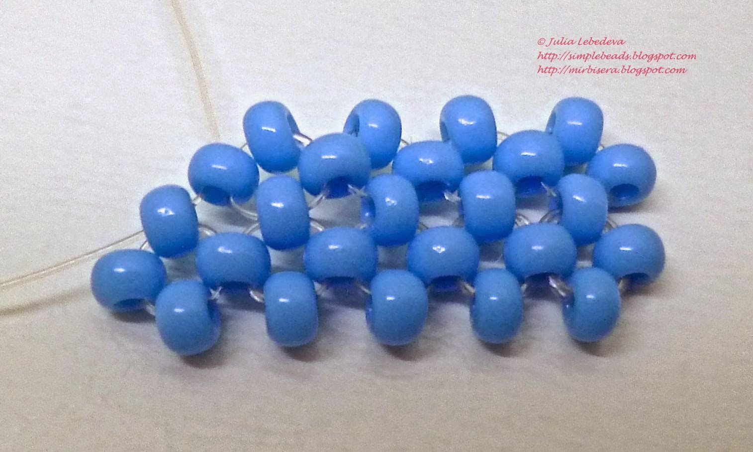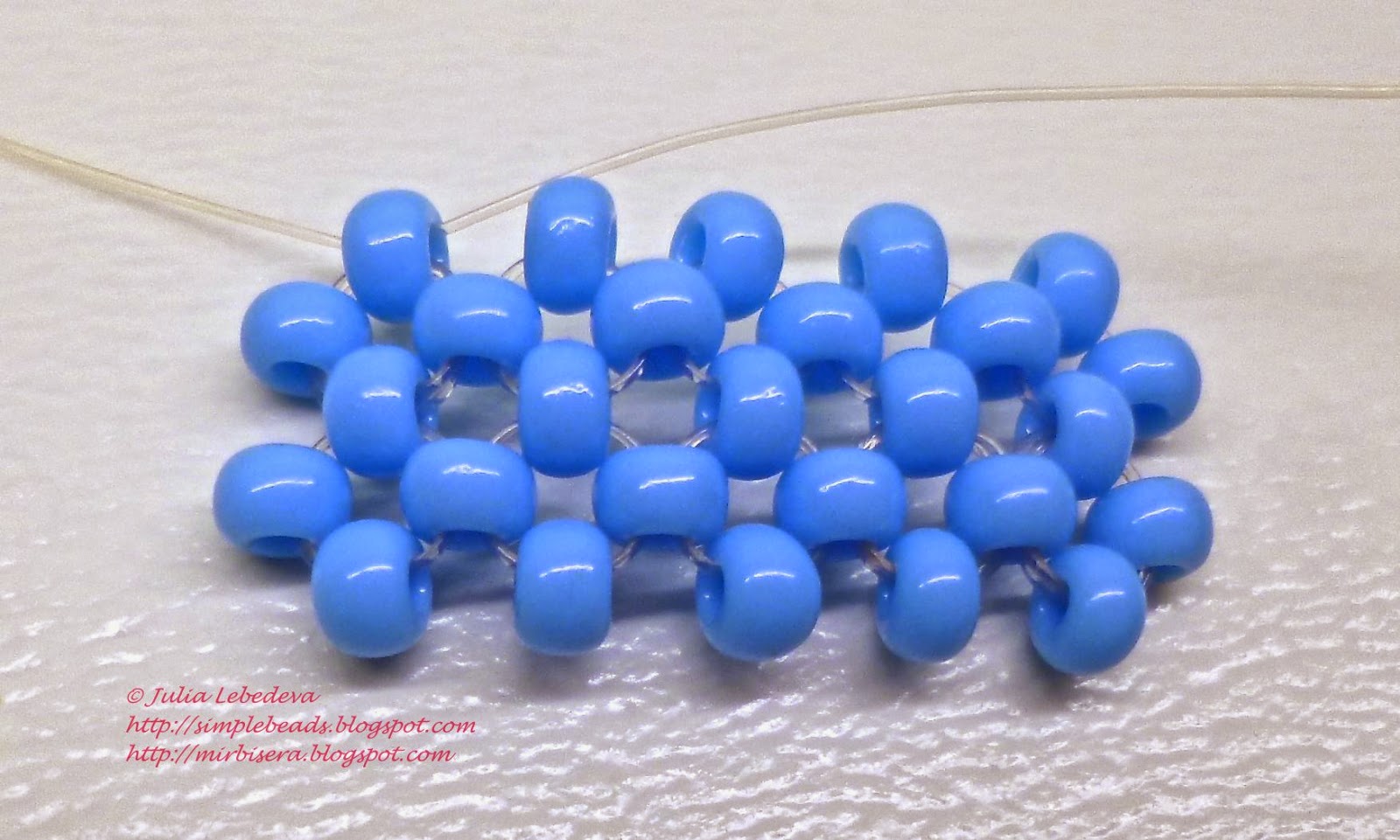 6. Все следующие ряды плетутся аналогично второму. Попрактиковавшись в плетении, можно заметить, что если нитка выходит из бисеринки вниз, то следующую ячейку нужно плести против часовой стрелки, а если вверх — по часовой.