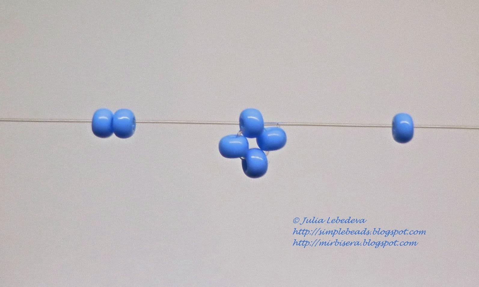 2. Набираем 3 бисеринки, возвращаемся в бисерину 2, затем снова протягиваем нить через бусины 5 и 6. Плетение идет по часовой стрелке.