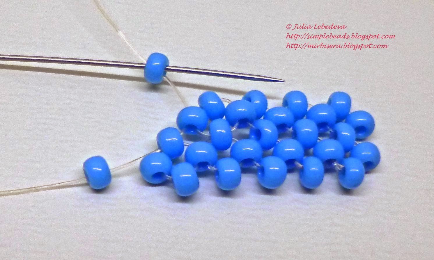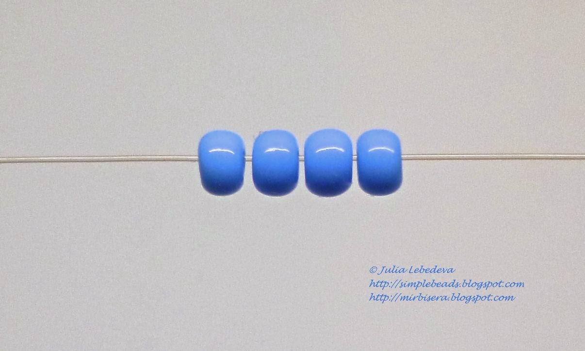 Лески понадобится длиной до 1,5. Первоначально набираются 4 бисерины. Необходимо оставить конец для закрепления нити и застежки, если она предусмотрена: 5-10 см должно хватить. Игла проводится через 1ю, 2ю, и 3ю бисерины.