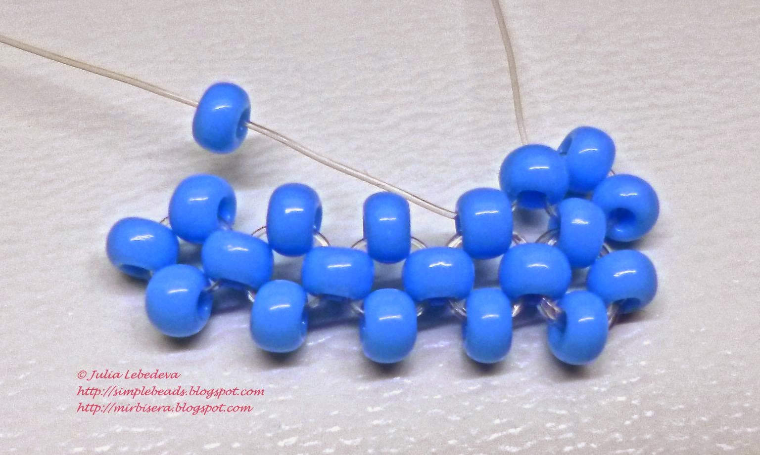 5. Далее нужно будет добавлять по 2 бусины, и проходить через верхние бусины первого ряда.
