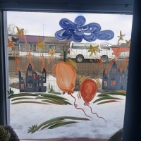 Нарисуйте на стекле воздушный шарик, раскрасьте его в красный цвет, а внутри белыми красками напишите «С Днем Победы» и дополните салютом. Это самый простой и быстрый вариант праздничного оформления окна.