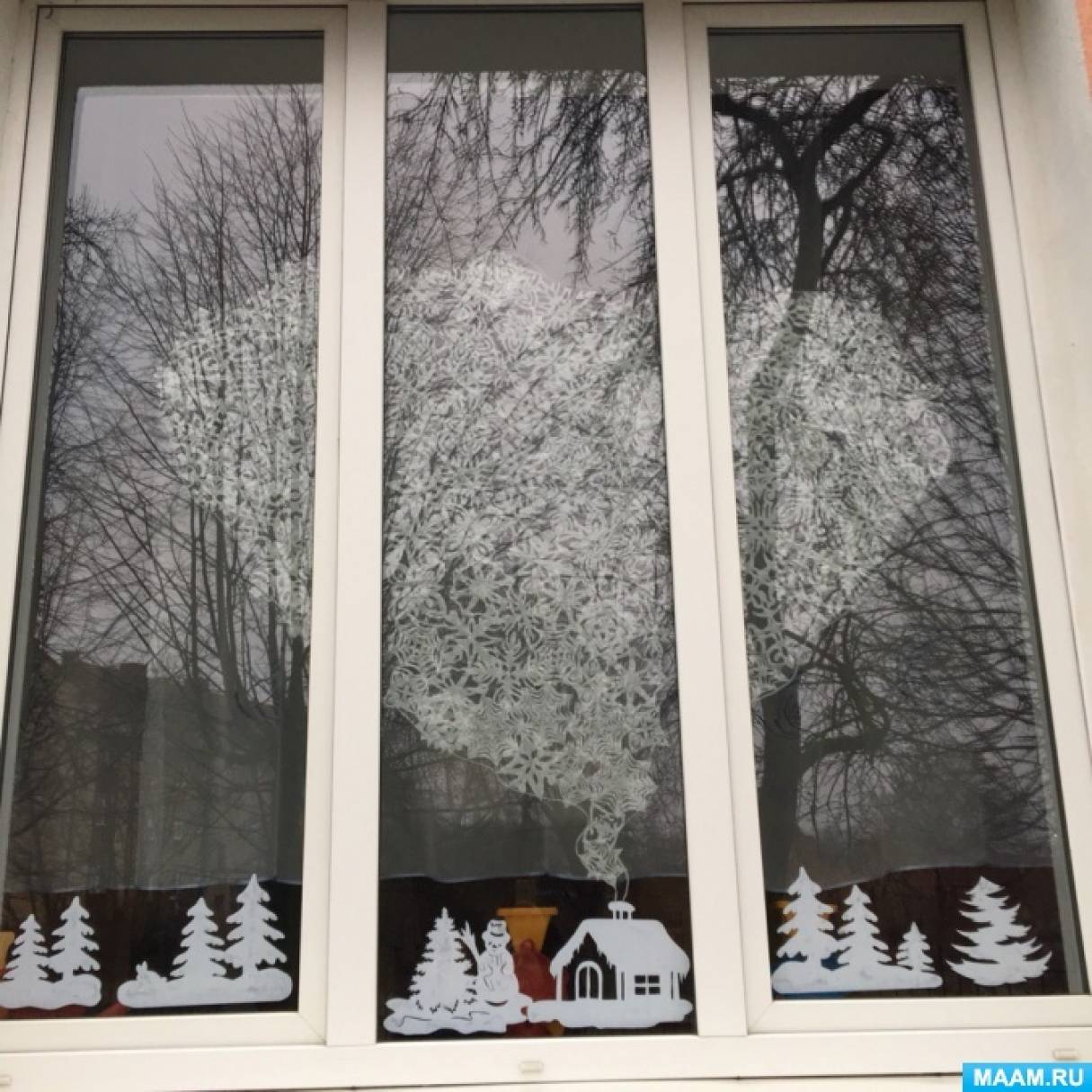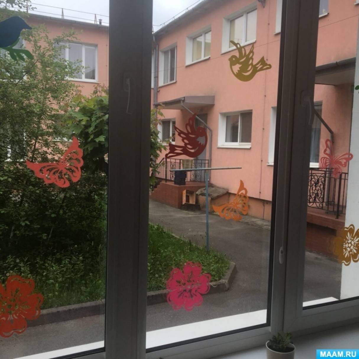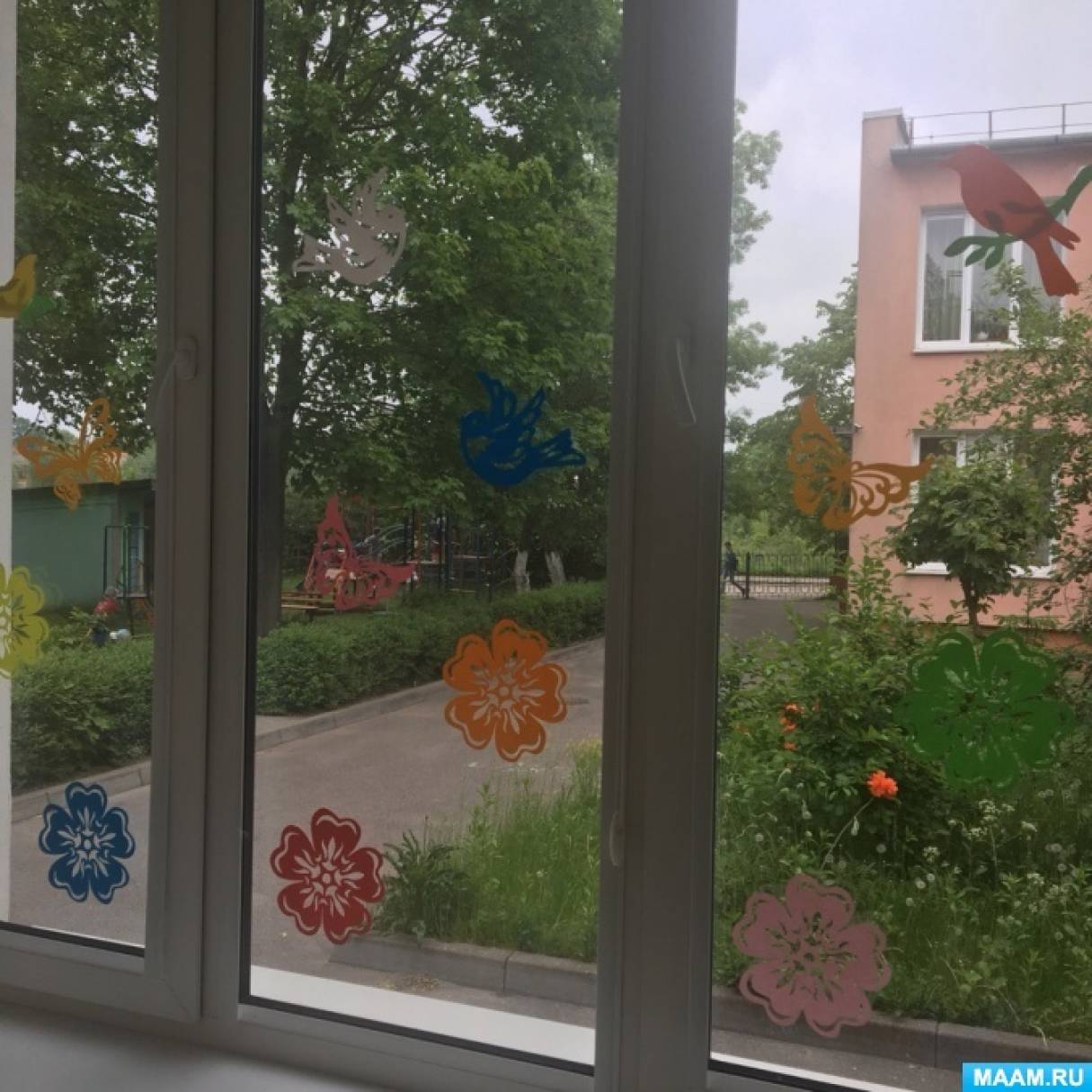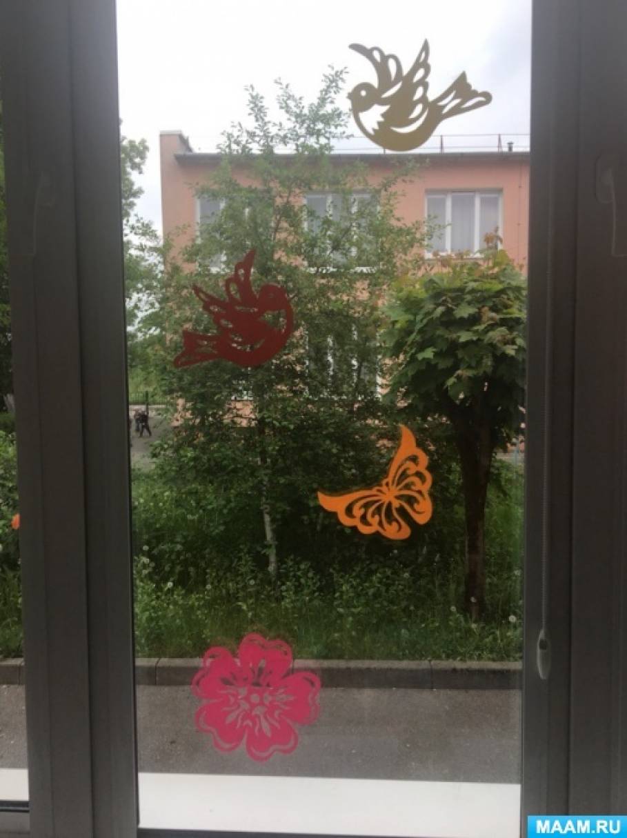 В нашей группе мы украшаем окна к каждому времени года. Зимой это делаем из белой бумаги и салфеток, к весне и лету из цветной бумаги.