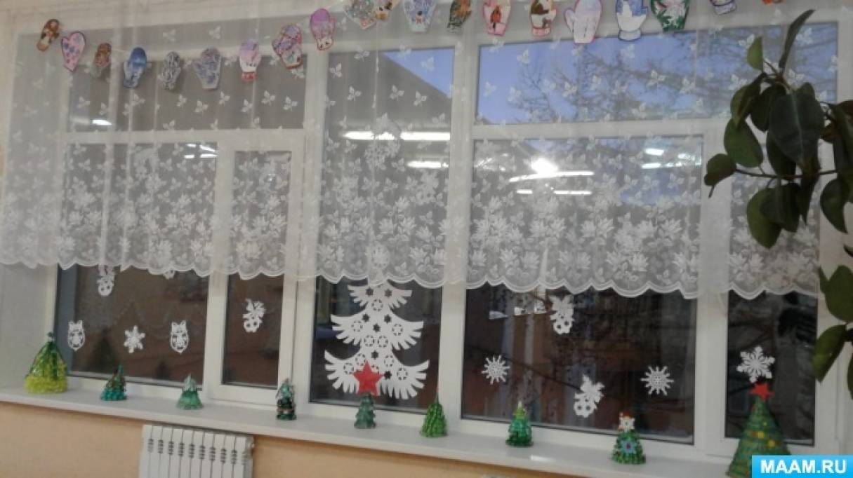 Чтобы в классе царила атмосфера уюта и праздника, при украшении кабинета стоит уделить особое внимание оконным стеклам и шторам. Снежинки из бумажных салфеток и цветной бумаги, объемные гирлянды из кружков, вытынанки и мишура — основные атрибуты, которые помогут в непростом деле.