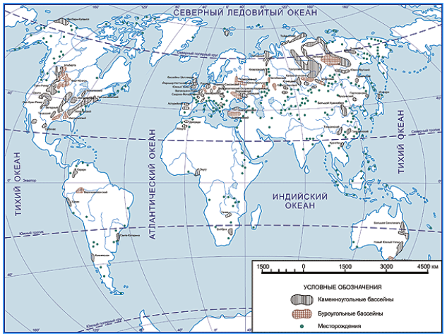 Уголь занимает наибольш у ю до лю ср е ди т опливных рес у рсов. Так, прим е рно 15% с у ши заня т о под у гольны м и бассейна м и, а их количество с остав л яет более 3 600. Б ольшая часть у гольных бассейнов ра с по л ожена в сев е рном пол у шарии ( рис. 2).