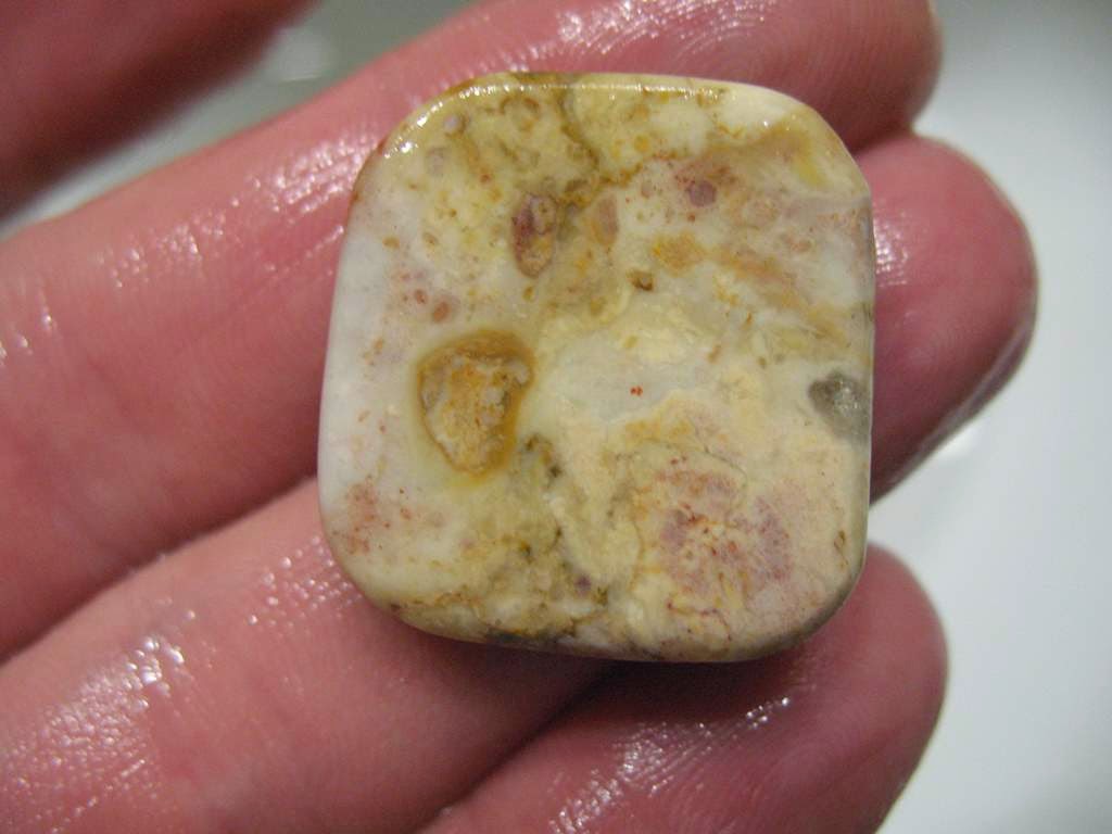 А эта заготовка кабошона из опализированной породы найденной в Подмосковье. Опал в Подмосковье? Моя мечта найти настоящий опал. Мечта дилетанта. Не может быть опала в куче ледниковых отложений. Опал должен герметически упакован в породе что бы не высохнуть. Опал потому и опал, что на 20-30 % состоит из воды.