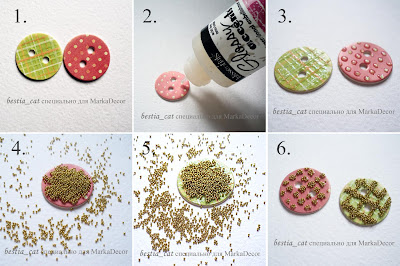 Я взяла пуговки от Ms.Painter (1). С помощью глосси-акцента на пуговке рисуем необходимый нам рисунок (2, 3). Затем посыпаем нашу пуговку микробисером (4, 5). И получаем интересные пуговки (6). Не забудьте, что необходимо дать время. чтобы глосси-акцент подсох!