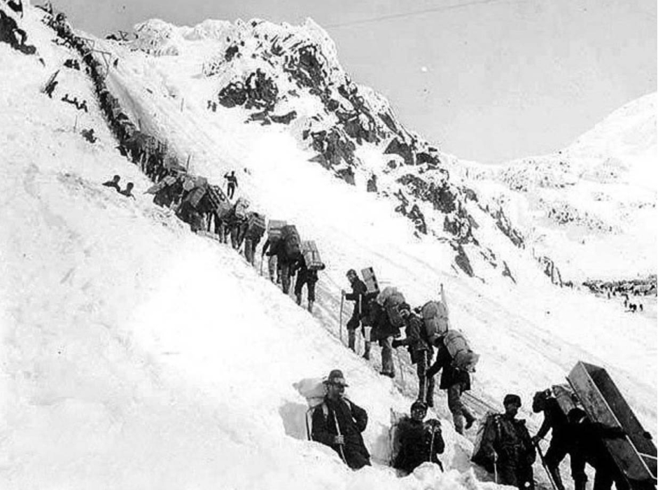 ЖЕРТВЫ ЗОЛОТОЙ ЛИХОРАДКИ ПЫТАЮТСЯ ПРЕОДОЛЕТЬ ПЕРЕВАЛ ЧИЛКУТ — ПЕРВУЮ ПРЕГРАДУ НА ПУТИ К ДОУСОНУ